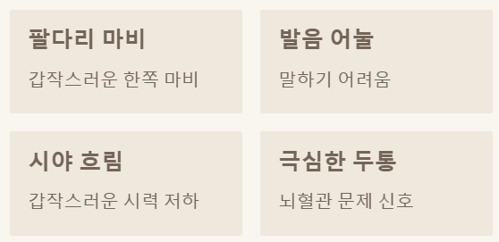 뇌로 가는 혈관이 좁아지거나 막히면 뇌졸중으로 이어질 수 있어요. 갑작스러운 한쪽 팔다리의 마비, 발음 어눌함, 시야 흐림, 극심한 두통 등이 대표적인 증상입니다.