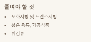 - 포화지방 및 트랜스지방 줄이기: 붉은 육류, 가공식품, 튀김류 섭취를 제한해야 합니다.