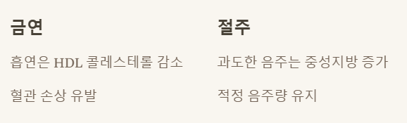 흡연은 HDL 콜레스테롤을 낮추고 혈관 손상을 유발해요. 과도한 음주는 중성지방 수치를 높이므로, 건강을 위해서는 금연하고 절주하는 것이 필수적입니다.