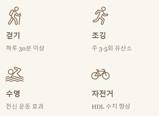 하루 30분 이상, 주 3~5회 유산소 운동은 HDL 콜레스테롤 수치를 높이고 LDL 콜레스테롤 수치를 낮추는 데 효과적이에요. 걷기, 조깅, 수영, 자전거 타기 등이 좋겠죠. 솔직히 꾸준히 운동하는 게 쉽지 않지만, 저는 요즘 퇴근 후 짧게라도 걷는 습관을 들이려고 노력하고 있습니다.