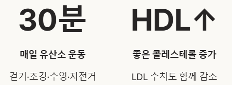 매일 30분 이상 꾸준히 유산소 운동을 하는 것이 HDL 콜레스테롤 수치를 높이고 LDL 콜레스테롤 수치를 낮추는 데 아주 효과적이라고 해요.