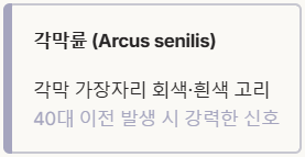 • 각막륜 (Arcus senilis): 각막 가장자리에 회색 또는 흰색의 고리 모양이 나타나는 현상입니다.