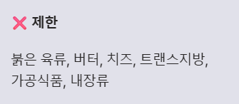 • 제한 식품: 포화지방(붉은 육류, 버터, 치즈), 트랜스지방(가공식품, 튀김류), 콜레스테롤 함량이 높은 음식(내장류)은 섭취를 줄이는 것이 좋습니다.