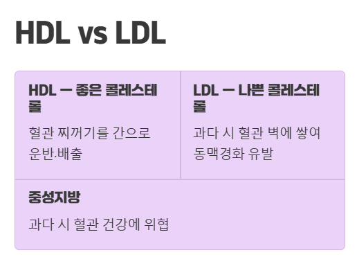 HDL은 혈관 속 찌꺼기를 간으로 운반해 배출을 돕지만, LDL은 수치가 너무 높으면 혈관 벽에 쌓여 동맥경화를 유발할 수 있어요.