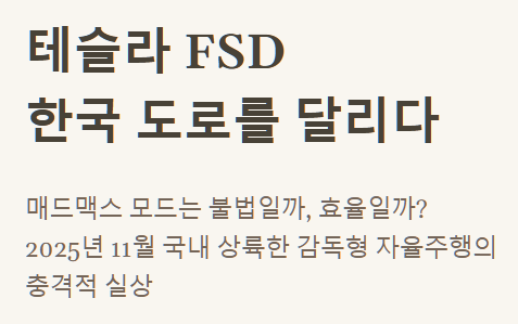 2025년 11월 말 국내에 상륙한 테슬라 감독형 자율주행(FSD)의 고속도로 테스트 보고서를 통해, 인간보다 더 인간처럼 운전하는 AI의 충격적인 실상과 그 속에 담긴 기술적 딜레마를 심층 분석합니다.
