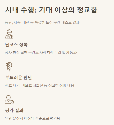 가장 먼저 눈에 띄는 부분은 동탄, 세종, 대전과 같이 도로 구조가 복잡하기로 소문난 도심 구간에서의 테스트 결과였습니다. 솔직히 말해서 시내 자율주행은 변수가 너무 많아 불안할 것으로 생각했는데, 평가는 '일반 운전자 이상의 수준'이라는 놀라운 결과가 나왔어요.
