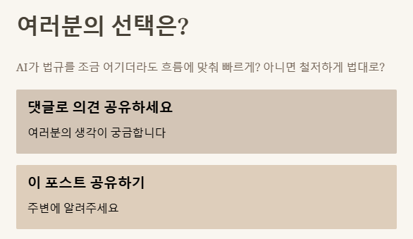 여러분은 AI가 법규를 조금 어기더라도 흐름에 맞춰 빠르게 가는 것을 원하시나요? 아니면 꽉 막히더라도 철저하게 법대로 가는 것을 원하시나요? 여러분의 생각이 궁금합니다. 댓글로 의견 남겨주세요! 더 궁금한 점도 언제든 환영입니다~ 😊