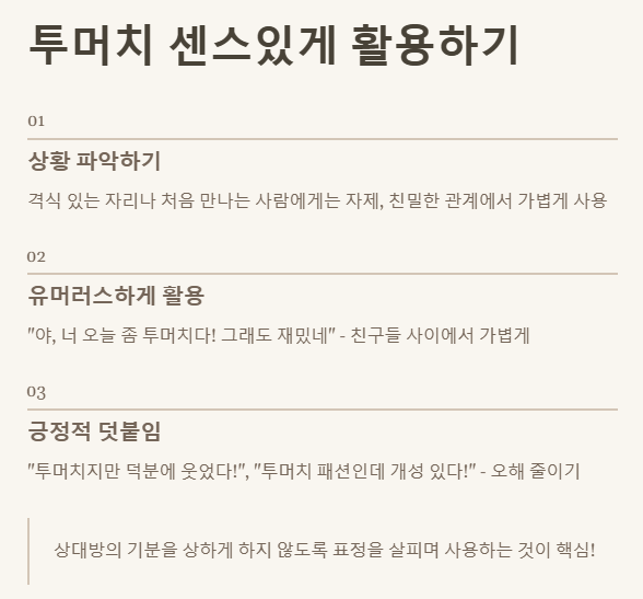 💡 팁: '투머치'를 사용할 때는 뒤에 긍정적인 덧붙임을 해주면 오해를 줄일 수 있어요. 예를 들어, "투머치지만 덕분에 웃었다!", "투머치 패션인데 개성 있다!", "투머치 설명인데 덕분에 이해 쏙쏙!" 와 같이요. 이렇게 덧붙이면 상대방도 기분 상하지 않고 함께 웃을 수 있을 거예요.