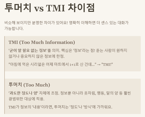 | 구분 | 투머치 (Too Much) | TMI (Too Much Information) |