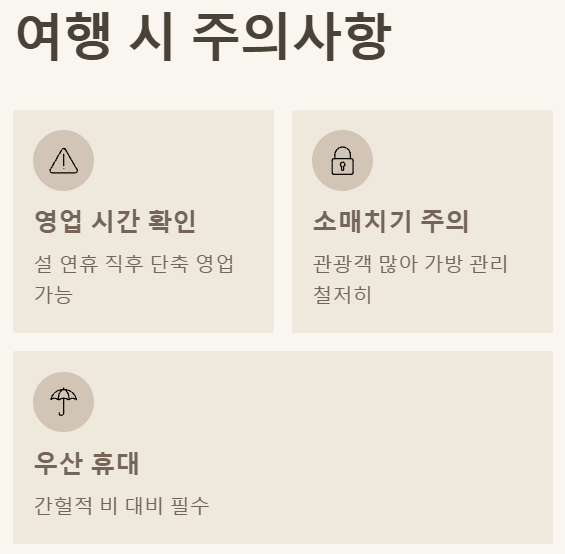 특히 일교차가 느껴질 수 있으니 저녁 식사나 야시장 구경 시에는 따뜻하게 입는 것이 좋습니다.