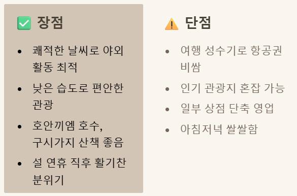 2월은 여전히 여행 성수기이기 때문에 항공권이나 숙소 가격이 조금 높을 수 있고, 인기 있는 관광지는 다소 붐빌 수 있습니다.