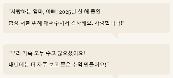 - "사랑하는 엄마, 아빠! 2025년 한 해 동안 항상 저를 위해 애써주셔서 정말 감사해요. 내년에도 건강하시고 행복한 일만 가득하시길 바라요. 사랑합니다!"