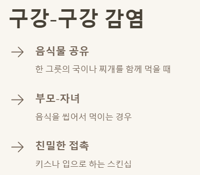 제가 겪어본 바로는, 가장 흔한 감염 경로로 추정되는 것이 바로 구강-구강 감염이에요. 침을 통해 균이 옮겨지는 경우를 말하죠. 예를 들어, 부모가 아이에게 음식물을 씹어서 먹여주거나, 여러 사람이 한 그릇의 음식을 함께 먹는 경우 (특히 한국에서는 국이나 찌개를 같이 먹는 문화가 있으니 더욱 신경 써야 할 부분 같아요), 또 키스나 입으로 하는 스킨십을 통해서도 감염될 가능성이 있다고 알려져 있습니다.