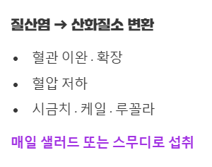 | 질산염 | 혈관 확장, 혈압 조절 | 시금치, 케일, 비트, 루꼴라 |
