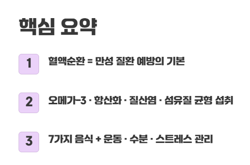 - 4. 식단 개선과 함께 규칙적인 운동, 충분한 수분 섭취, 스트레스 관리가 혈액순환 개선의 핵심 열쇠입니다.