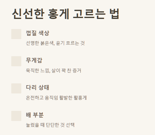 • ✅ 신선한 홍게는 선명한 껍질, 묵직한 무게, 활발한 다리를 확인하세요.