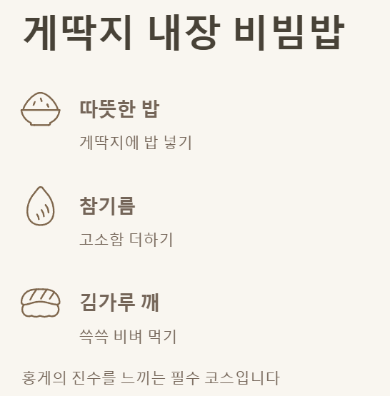 아, 그리고 홍게를 먹는다면 게딱지 내장 비빔밥은 절대 빼놓을 수 없죠! 다 먹고 난 내장에 따뜻한 밥, 참기름, 김가루, 깨를 넣고 쓱쓱 비벼 먹으면... 음, 생각만 해도 군침이 도네요. 이건 진리입니다, 진짜! 홍게를 제대로 즐겼다고 말하려면 게딱지 밥은 필수 코스라고 생각해요.