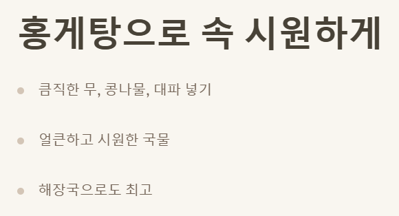 얼큰하고 시원한 국물을 좋아한다면 홍게탕도 좋은 선택이에요. 큼직하게 썬 무, 콩나물, 대파 등을 넣고 홍게를 넣어 함께 끓이면 속 시원한 해장국으로도 그만이죠. 칼칼한 국물에 술 한 잔 곁들이면... 크으! 상상만 해도 최고네요.