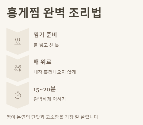 가장 흔하면서도 실패 없는 방법이죠. 찜기에 물을 넣고 센 불에 15~20분 정도 찌면 끝이에요. 이때, 홍게를 배 부분이 위로 향하게 쪄야 맛있는 내장이 흘러나오지 않고 고소함을 온전히 유지할 수 있습니다. 찜기가 없다면 큰 냄비에 물을 조금 붓고 채반을 이용해도 충분해요. 잘 쪄진 홍게를 한입 베어 물면... 아, 정말이지 천국이 따로 없어요! 저는 찜이 가장 맛있더라구요, 다른 건 다 양보해도 찜은 못 잃어요.