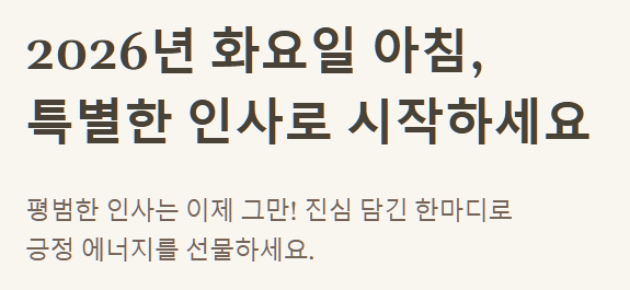 매주 화요일, 새로운 시작을 응원하는 마음으로 따뜻하고 활기찬 아침 인사말을 모아봤어요. 직장 동료, 친구, 가족에게 전할 수 있는 다양한 문구와 함께 긍정적인 에너지를 불어넣는 2026년 맞춤 인사말 팁까지! 지친 일상에 작은 미소를 선물하고 싶은 분들을 위해 준비했습니다. 지금 바로 확인해 보세요!