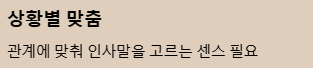 • 직장 동료, 친구, 가족 등 상황과 관계에 맞춰 인사말을 고르는 센스가 필요합니다.