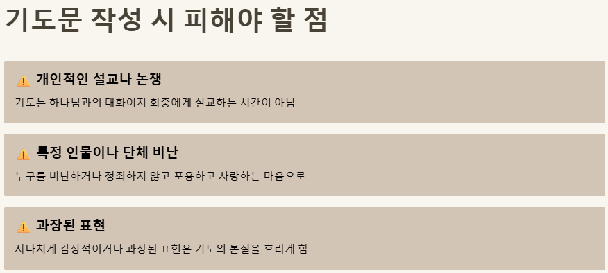 - ✔️ 기도 시 피해야 할 것: 개인 설교, 비난, 과장된 표현은 삼가고 겸손한 자세로 임해야 합니다.