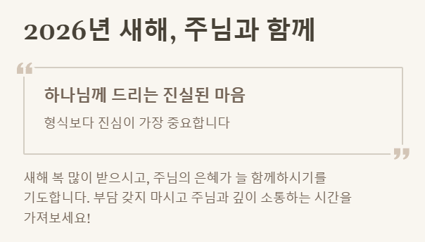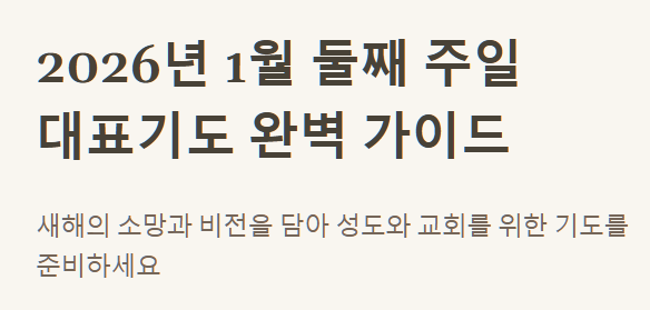 그래서 오늘은 2026년 1월 둘째 주일, 이 중요한 시점에 우리가 어떤 기도를 드릴 수 있을지에 대한 저의 생각과 함께, 실제적인 기도문 예시들을 여러분과 나누고자 합니다. 이 글이 여러분의 기도 준비에 작은 도움이 되기를 진심으로 바랍니다. 음... 그럼 이제부터 본격적으로 새해 첫 기도 준비를 함께 해볼까요?