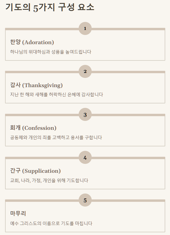 - 균형 잡힌 내용: 감사, 회개, 간구(성도, 교회, 나라와 민족, 세계 선교) 등 기도의 다양한 요소를 균형 있게 포함하는 것이 중요해요.