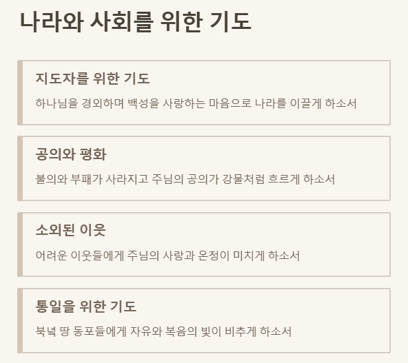 | 간구(나라/사회) | 안정, 지도자, 소외 이웃, 통일 | "이 나라 대한민국과 이 땅의 모든 백성을 위해서도 간구합니다." |