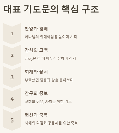 기도문은 보통 찬양(경배) – 감사 – 회개 – 간구(중보) – 헌신 및 축복의 흐름을 따르는 것이 좋습니다. 이 다섯 가지 요소를 적절히 배분하여 어느 한쪽에 치우치지 않도록 균형을 잡는 것이 중요해요. 특히 연말인 만큼 감사와 회개, 그리고 새해를 향한 간구가 더 비중 있게 다뤄질 수 있습니다.