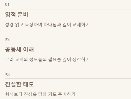 무엇보다 중요한 건 기도자의 영적인 준비예요. 기도를 맡았다는 소식을 들으면 괜히 부담스럽고 떨리기도 하죠. 하지만 이 시간을 통해 하나님과 더 깊이 교제하고, 내가 드리는 기도가 다른 사람들에게도 은혜가 될 수 있도록 간절히 구해야 해요.
