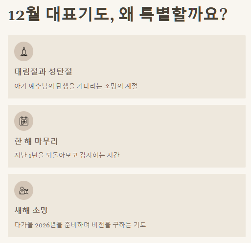 저는 기도를 준비하면서 미리 성경을 읽고 묵상하며, 하나님께서 이 12월에 우리 교회와 성도들에게 어떤 마음을 주시는지 깊이 생각하려고 노력했어요. 기도문 작성 자체보다 이 과정이 훨씬 중요하다고 느껴요.