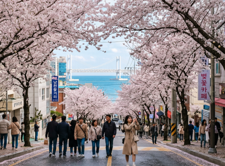경주는 3월 말에서 4월 초가 적기입니다. - 부산 남천동 벚꽃길: 아파트 단지 사이로 펼쳐지는 벚꽃길은 부산 시민들의 숨은 명소입니다.