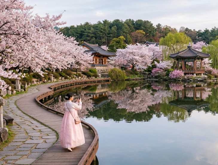진해는 3월 말에서 4월 초가 절정입니다. - 경주 보문단지: 고즈넉한 한옥과 어우러진 벚꽃 풍경은 정말 아름다워요.