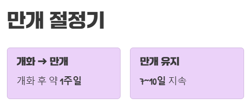 하지만 기온, 비, 바람 등 날씨 조건에 따라 이 기간은 짧아질 수 있으니, 만개 시기에 맞춰 방문하는 것이 좋아요.