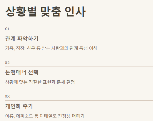 - 3. 적절한 타이밍: 너무 늦지 않게, 그리고 상황에 맞는 채널(대면, 전화, 메시지)로 인사를 전하세요.