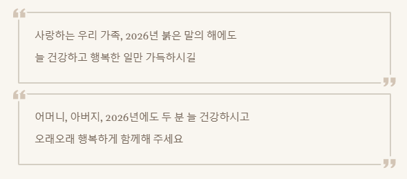 - 사랑하는 우리 가족, 2026년 붉은 말의 해에도 늘 건강하고 행복한 일만 가득하시길 바랍니다. 새해 복 많이 받으세요!