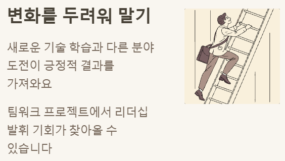 - 변화 수용: 예상치 못한 변화나 새로운 도전이 찾아올 때, 긍정적인 마음으로 받아들이고 유연하게 대처하는 능력을 기르세요.