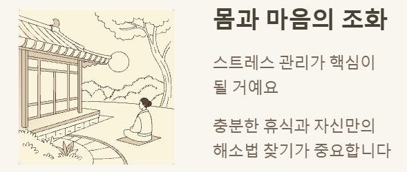 - ✔️ 건강 관리 필수: 스트레스 관리와 꾸준한 운동으로 활력 유지.