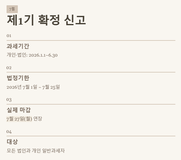 - 2026년 7월은 법인사업자와 개인 일반과세자의 상반기 실적에 대한 부가가치세 확정 신고 기간입니다. 마감일 연장에 유의하세요.