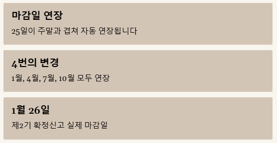 그래서 이번 2026년에는 1월, 4월, 7월, 그리고 10월의 마감일이 모두 연장될 예정입니다. 특히, 2026년 1월의 제2기 확정신고는 1월 26일(월)까지가 실무적인 마감일이 된다는 점, 꼭 기억해야 할 핵심 포인트 중 하나예요.