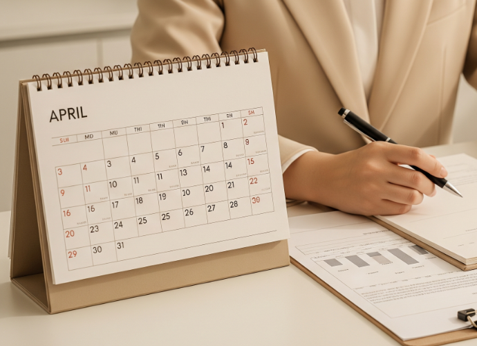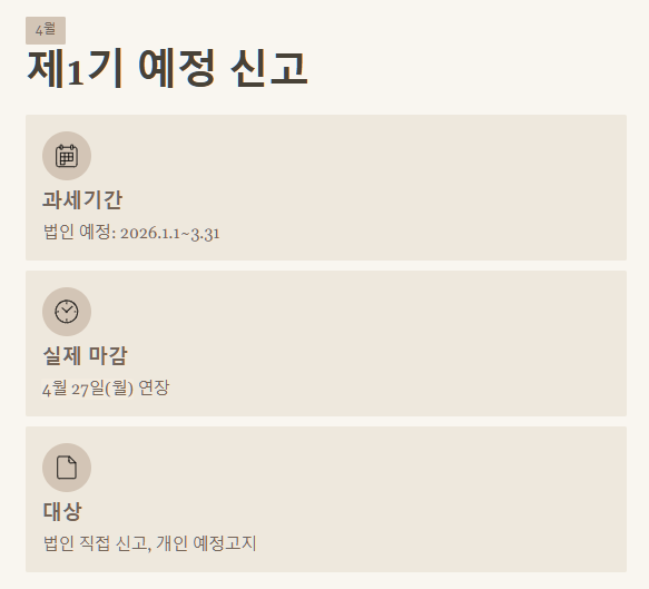 - 2026년 4월은 법인사업자의 제1기 예정신고와 개인 일반과세자의 예정고지가 있는 달입니다. 4월 역시 마감일이 연장됩니다.