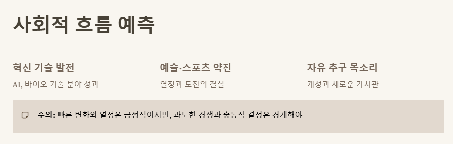 ✔️ 사회적으로는 혁신, 성장, 자유 추구가 가속화될 수 있으며, 개인에게는 새로운 도전의 기회가 많습니다.