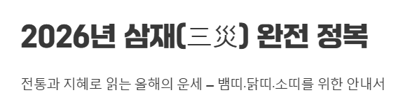 • 2026년은 뱀띠, 닭띠, 소띠의 '눌삼재' 시기입니다. 삼재의 기운이 가장 강하게 머무는 시기라고 볼 수 있어요.