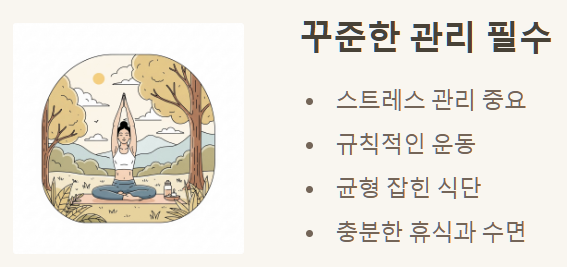 규칙적인 운동과 균형 잡힌 식단은 물론이고, 충분한 휴식과 수면을 통해 몸과 마음의 활력을 유지하는 것이 필수적입니다.