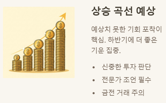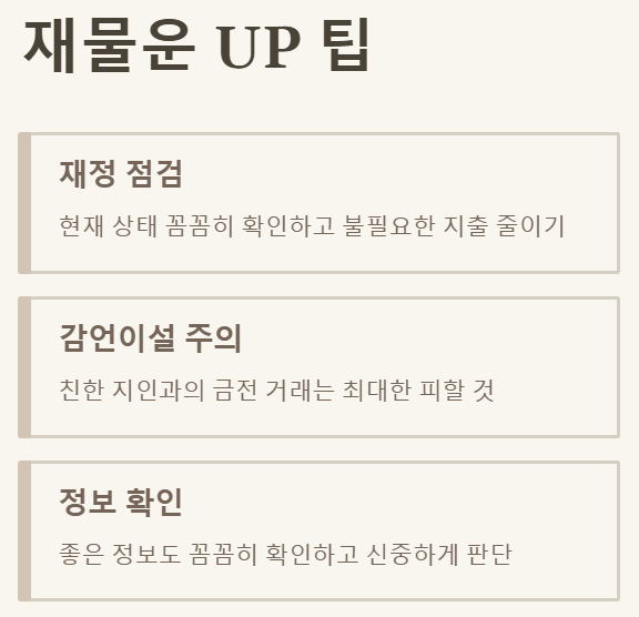 - ✅ 재물운 상승세, 하지만 신중한 투자가 필수! 하반기 기회를 노리되, 주변 유혹에 주의하세요.