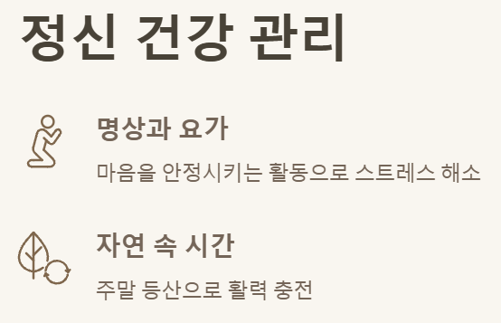 명상이나 요가처럼 마음을 안정시키는 활동을 해보거나, 자연 속에서 시간을 보내는 것도 좋은 방법이에요.