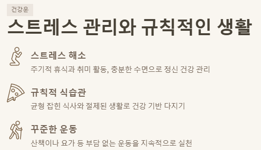 식습관은 규칙적으로 유지하고, 가벼운 운동을 꾸준히 하는 것도 좋습니다.