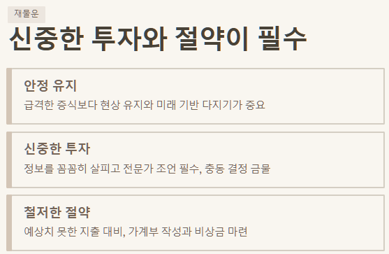 충동적인 지출을 줄이고, 비상금을 마련하며, 투자는 장기적인 관점에서 충분한 정보를 얻은 후 진행하는 것이 좋습니다.