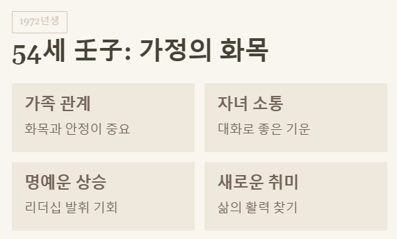 ✅ 1972년생 (54세) 壬子 쥐띠: 가정의 화목과 사회적 책임